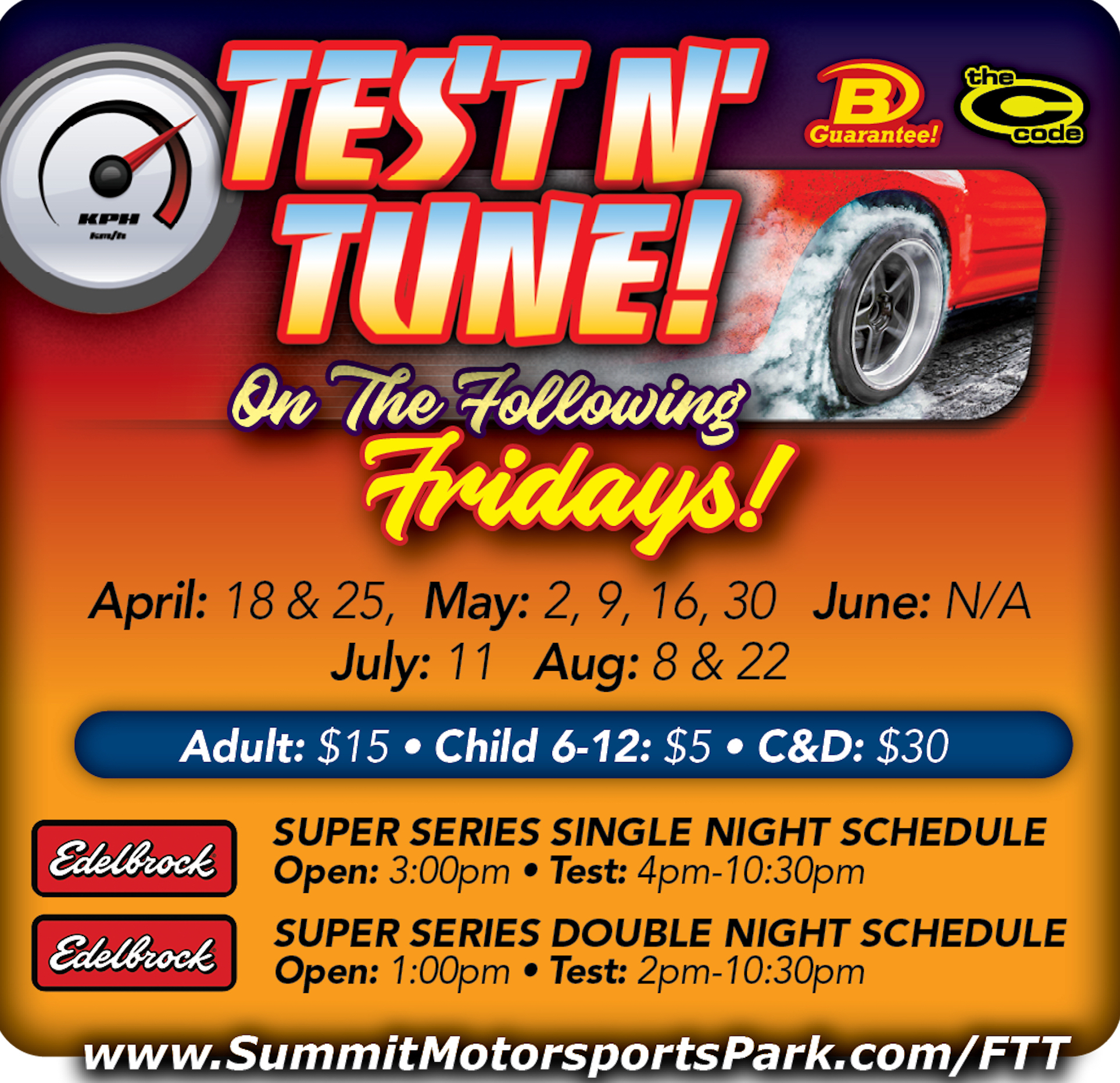 Edelbrock Super Series Single Night Schedule: Gates open at 3 p.m., and testing is 4-10:30 p.m.